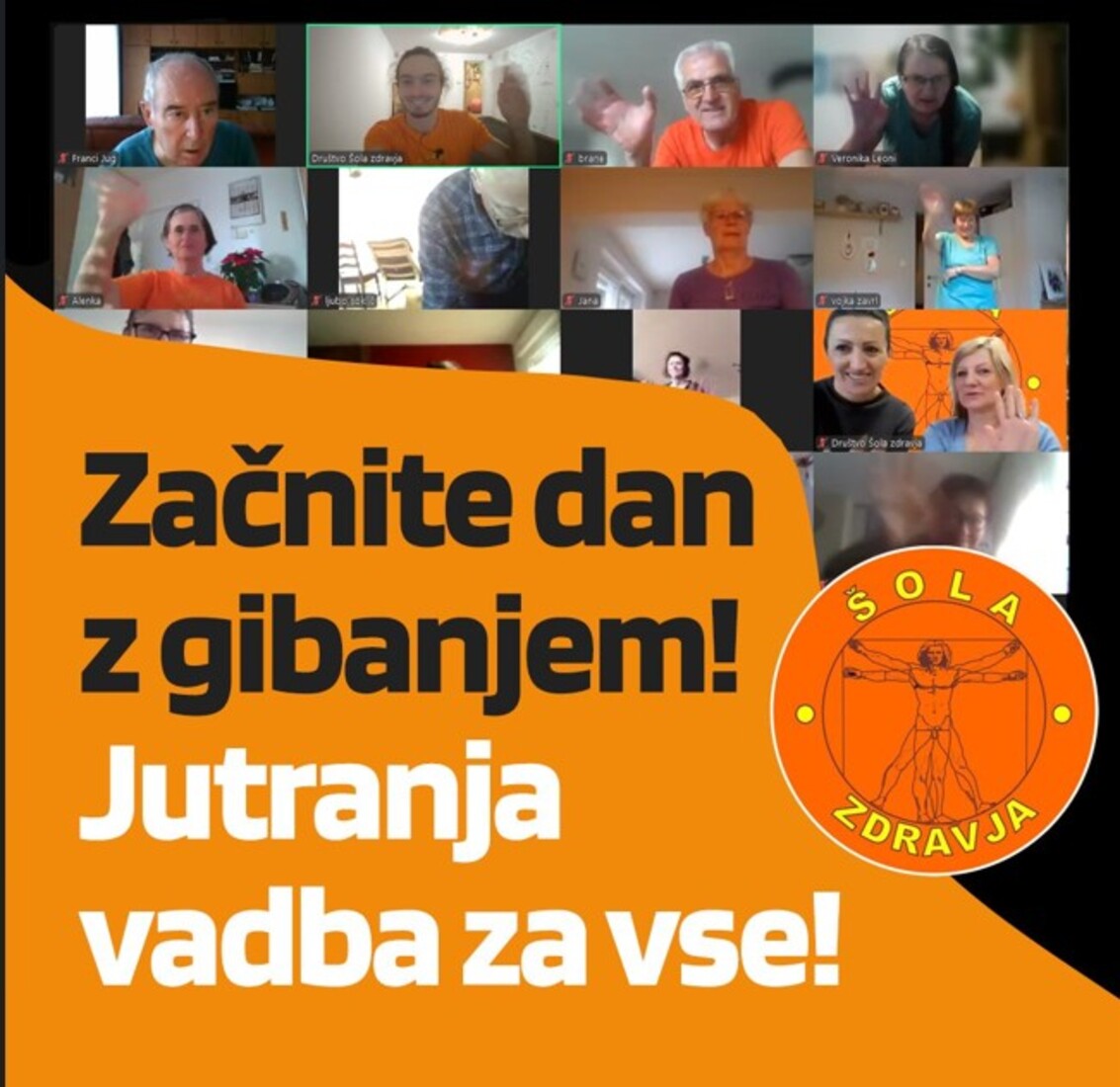V prvih dveh mesecih leta 2026 Društvo Šola zdravja podarja brezplačno jutranje razgibavanje, ki bo potekalo preko platforme Zoom. Vadba bo na voljo od 5. januarja do 27. februarja, vsak delovni dan od 8. do 9. ure.